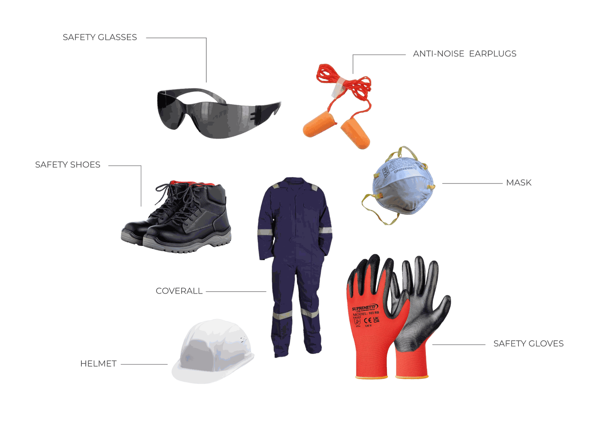 Our safety products include essential protective gear such as safety glasses, anti-noise earplugs, coveralls, and safety gloves—designed to ensure maximum protection and comfort in industrial and construction environments.